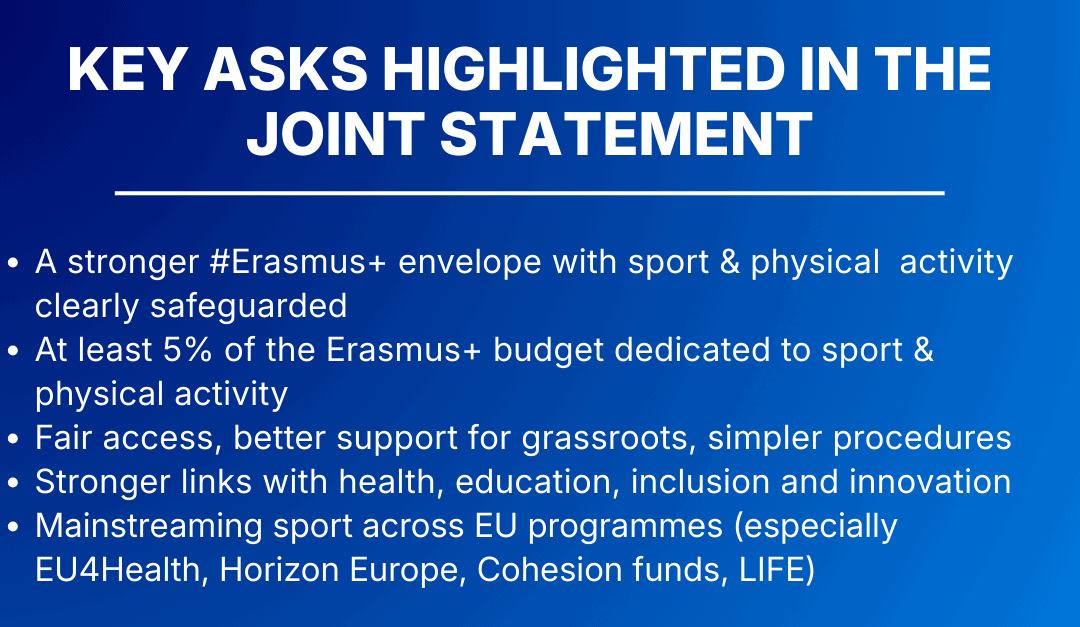 The Joint Statement highlights key priorities, including safeguarding sport within Erasmus+, allocating at least 5% of the programme budget to sport and physical activity, improving access for grassroots organisations, simplifying procedures, and strengthening links with related EU policies and programmes such as health, education, inclusion, innovation and cohesion.